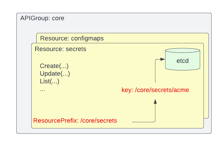 For example, secrets resources in the core API group gets their own storage.